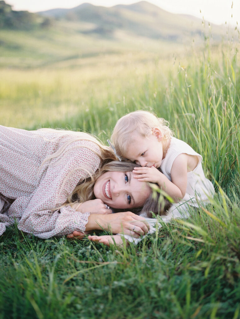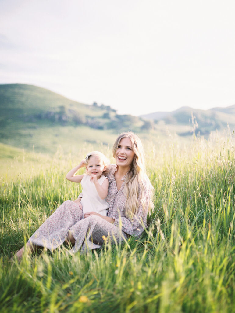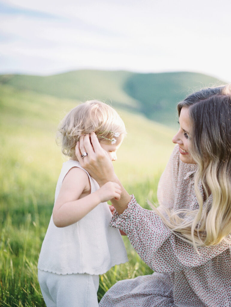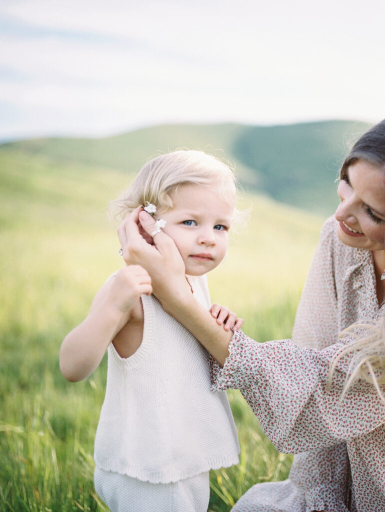 The photographs move gently between wide, story-filled frames and quiet, tender details. In one moment, mother and daughter sit together in tall grass, laughing and sharing the kind of unguarded joy that children bring so effortlessly. In another, the mother adjusts a small flower tucked into her daughter’s hair, a simple gesture that speaks volumes about care, patience, and love.