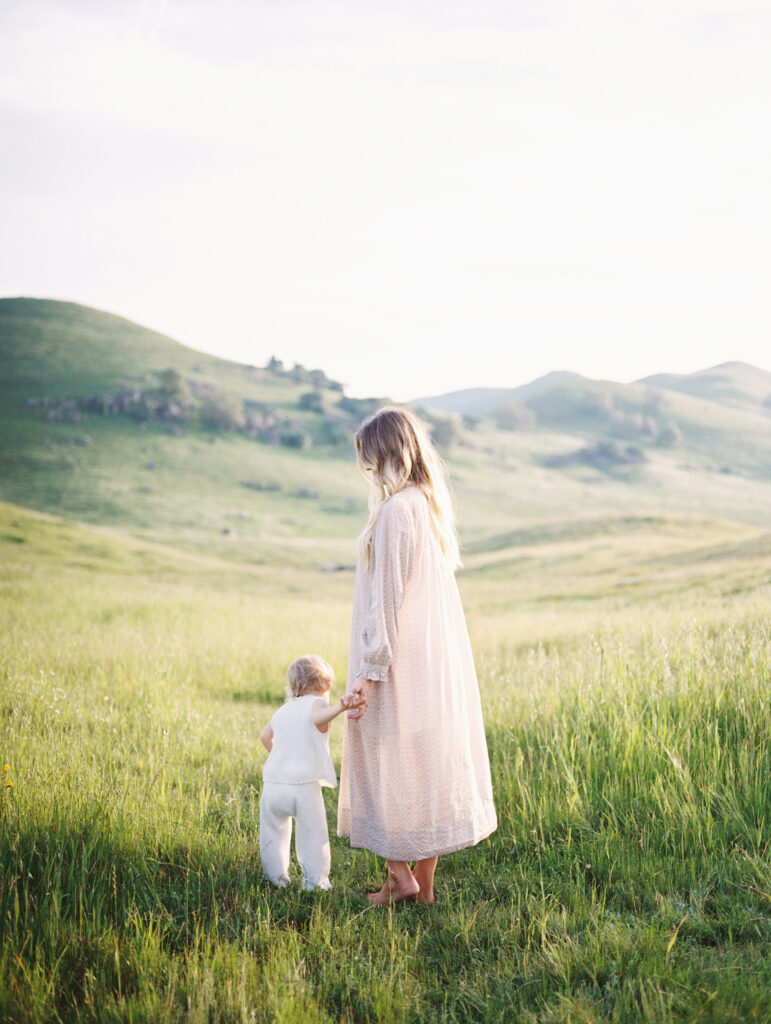 Perhaps the most touching element throughout the series is the trust between mother and child. The way the little girl leans into her mother’s arms, the way their hands instinctively find one another as they walk through the grass. These are the small anchors of childhood, the moments that shape a sense of safety and belonging.