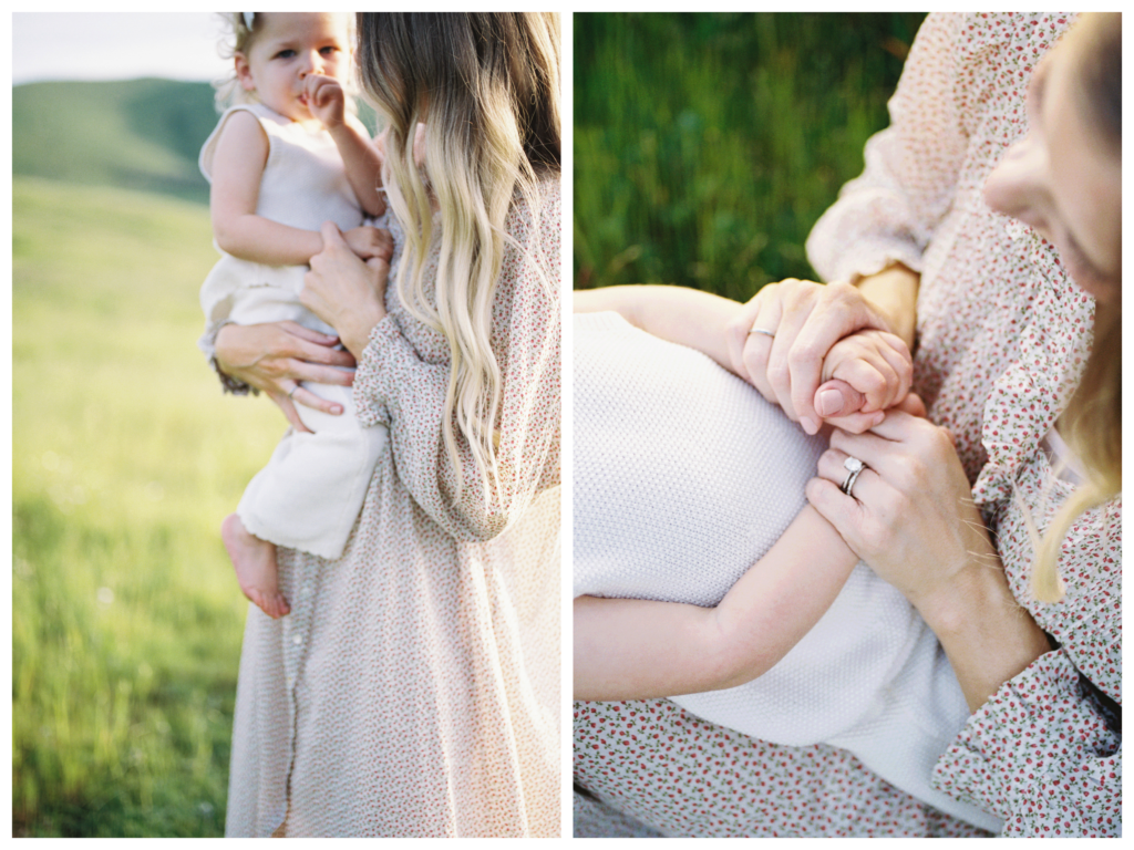 Amanda Deanne photographs these moments with remarkable sensitivity. Nothing feels forced or overly posed. The child wanders, is carried, holds hands, rests her head on her mother’s shoulder. Each frame feels like a natural continuation of the one before it. This quiet storytelling approach allows the viewer to feel present in the scene rather than simply observing it.
